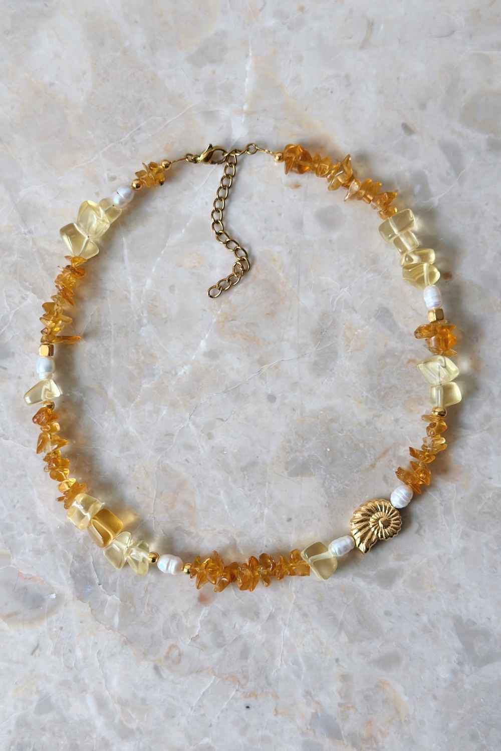 ● Υλικό: ημιπολύτιμος λίθος κεχριμπάρι, κρυστάλλινες πέτρες , επιχρυσωμένα ορειχάλκινα στοιχεία, μαργαριτάρια γλυκού νερού , και κούμπωμα από επιχρυσωμένο ατσάλι.